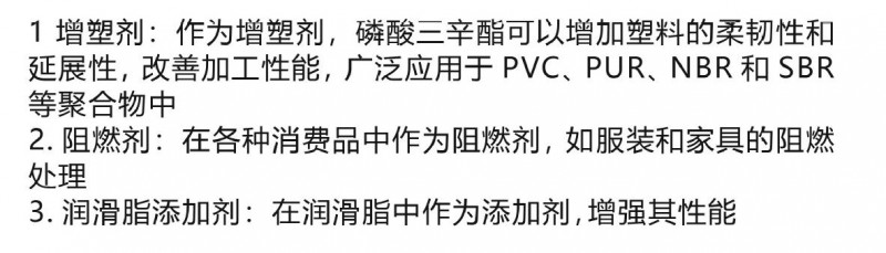 产品特点:磷酸三辛酯作为一种阻燃剂、增塑剂、萃取剂,在化工生产中被广泛地使用,其最重要的用途在于过氧化氢生产。磷酸三辛酯作为氢蒽醌溶剂,具有氢蒽醌溶解度高、过氧化氢在水与溶剂之间的分配系数高、沸点高、燃点高等条件.