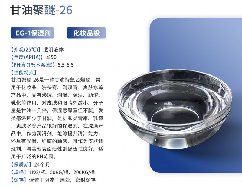 PEG-26 甘油醚, 优良的保湿剂、润滑剂。在化妆品和洗涤产品所应用的广泛PH值范围内都保持稳定,与阳离子,非离子以及阴离子表面活性剂有良好的相容性。无油腻感,并有光滑,细腻的触感。它优异的润滑效果尤其适合用于剃须膏,须后水、爽肤水中。在膏霜和乳液中是非常有效的保湿剂。它是很好的颜料分散中间体和头发定型用品中的塑形剂,在皂类产品和洗涤用品中它可以使泡沫更加丰富,易于清洗。特别推荐应用于剃须膏中作为保湿剂、润滑剂和泡沫调节剂。