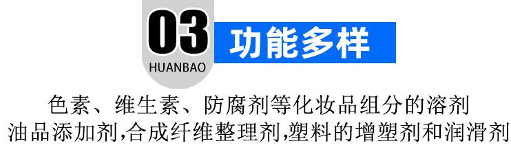 产品用途:色素、维生素、防腐剂等化妆品组分的溶剂油品添加剂,合成纤维整理剂,塑料的增塑剂和润滑剂。