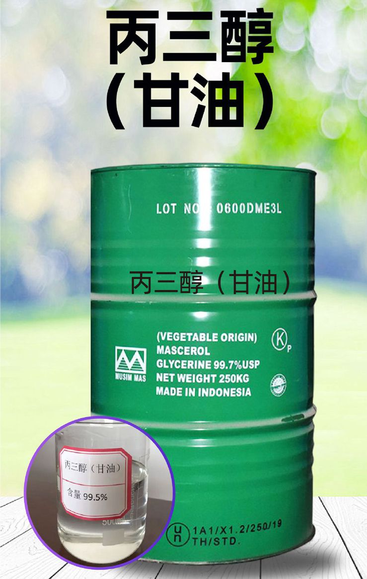 甘油有称丙三醇,是一种无色、透明、无臭、黏稠液体,味甜,具有吸湿性。用作基本有机化工原料,广泛用于纺织、印染、造纸、印刷、洗涤剂、日化、制酒、食品、卷烟、玻璃纸、搪瓷、石油、电子、橡胶、塑料、制革、化学、化纤等行业。用作保湿剂、保润剂、吸湿剂、润滑剂、柔软剂、软化剂、增稠剂、增塑剂、稀释剂、防冻剂等。
