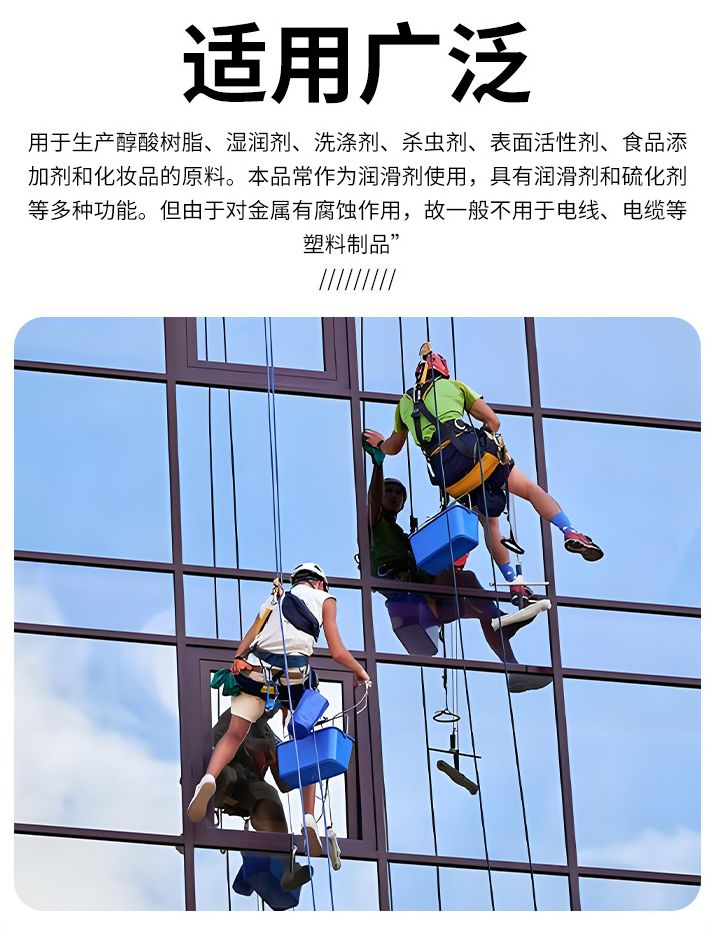 用于生产醇酸树脂、湿润剂、洗涤剂、表面活性剂、食品添加剂和化妆品的原料等。本品常作润滑剂使用,具有润滑剂和硫化剂等多种功能。但由于对金属有腐蚀作用,故一般不用于电线、电缆扥塑料制品。本品应用于表面活性剂工业最为广泛,还可用于香料、纺织印染、化妆品行业、制革行业工业等。