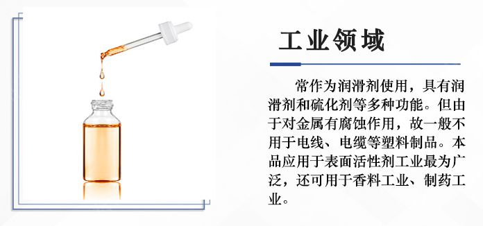 白色针状晶体,微有月桂油香味。用于生产醇酸树脂、湿润剂、洗涤剂、杀虫剂、表面活性剂、食品添加剂和化妆品的原料。本品常作为润滑剂使用,具有润滑剂和硫化剂等多种功能。但由于对金属有腐蚀作用,故一般不用于电线、电缆等塑料制品。本品应用于表面活性剂工业最为广泛。