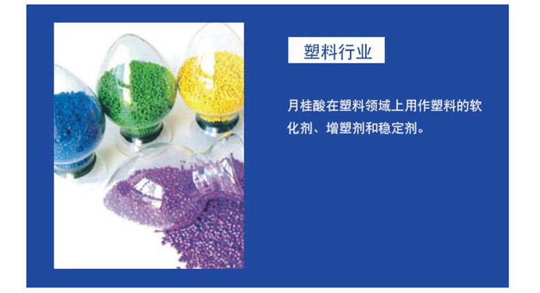 2.用作配制粘接用的表面处理剂。还用于制造醇酸树脂、化学纤维油剂、杀虫剂、合成香料、塑料稳定剂、汽油及润滑油的抗腐蚀添加剂。大量用于制造各种类型的表面活性剂,如阳离子型有月桂胺、月桂腈、三月桂胺、月桂基二甲基胺、月桂基三甲基铵盐等;阴离子型有月桂基硫酸钠、月桂酸硫酸酯盐、月桂基硫酸三乙醇铵盐等;两性离子型有月桂基甜菜碱、月桂酸咪唑啉等;非离子型表面活性剂有聚L-醇单月桂酸酯、聚氧乙烯月桂酸酯、月桂酸甘油酯聚氧乙烯醚、月桂酸二乙醇酰胺等。此外也用作食品添加剂及用于制造化妆品等。